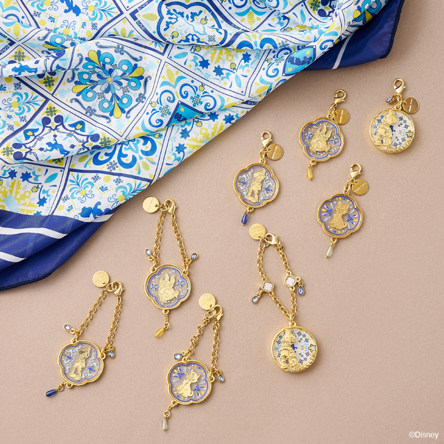 バッグチャームやファスナートップはタイル柄がステンドグラスのように透け、そこにピノキオやフィガロを配置。