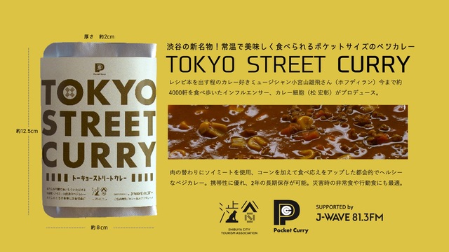 防災備蓄食として、また渋谷のお土産としても使える新しいコンセプトのカレー。味はソイミートの入ったベジカレーで、常温でも食べることができ、コンパクトサイズで2年の長期保存が可能。会場でもお土産として販売される。(監修:カレー細胞・松 宏彰氏、渋谷区観光協会観光大使・小宮山雄飛氏)