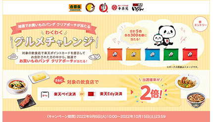 楽天ペイメントは9月16日~10月15日23時59分の期間、共通ポイントサービス「楽天ポイントカード」において、飲食に関連する加盟店が参画する「わくわくグルメチャレンジ!抽選でお買いものパンダ クリアポーチが当たる!」を実施する。