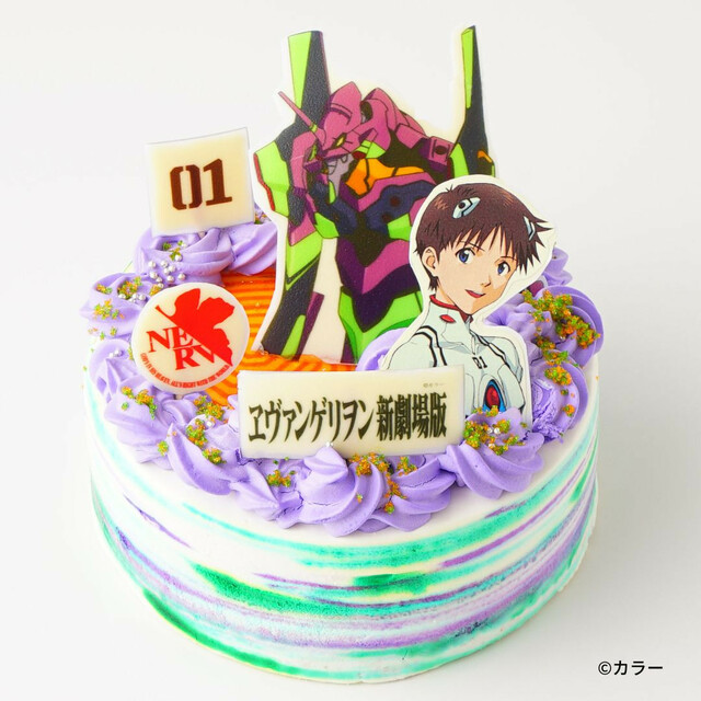 シンジと初号機が飾られたケーキは、キャラクターのカラーとも言える華やかなパープルが特徴的。