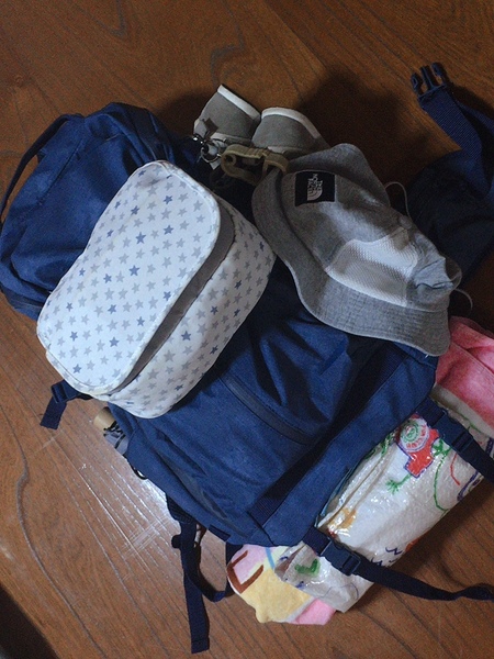 実際に物を収納してみました。パソコンをメインポケット内部の背中部分に、お菓子や日焼け止め、携帯ミルクなど、こまごまとしたものは正面ポケットやメインポケットの中のメッシュポケットへ入れます。