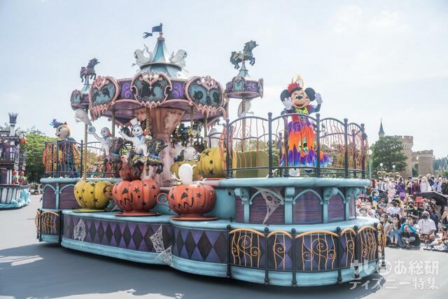 ゴースト仕様のコスチュームに身を包んだミッキーマウスやミニーマウスとディズニーの仲間たちが、“お墓だらけのシンデレラ城”をイメージしたフロートや、“スケルトンが運行するウエスタンリバー鉄道”をイメージしたフロートなどに乗って登場。