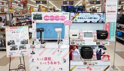 今回、新しい売場づくりを行ったのは、大阪府下の「ジョーシン 茨木店」と「ジョーシン みのおキューズモール店」の2店舗で、学生のアイデアが詰まったドライヤーと炊飯器の特設コーナーを10月31日まで展開している。