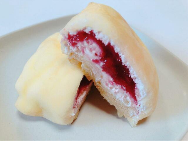 中には苺ソースとレアチーズクリームがたっぷり!苺ソースにはツブツブの果肉もたくさん入っているので、食感も楽しめます。
