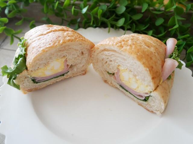 『カンテボーレ』の人気食事パンシリーズ『ルヴァンで引き立つ塩パン(全粒粉入り)』に、ロースハムとタマゴサラダをサンドした一品。
