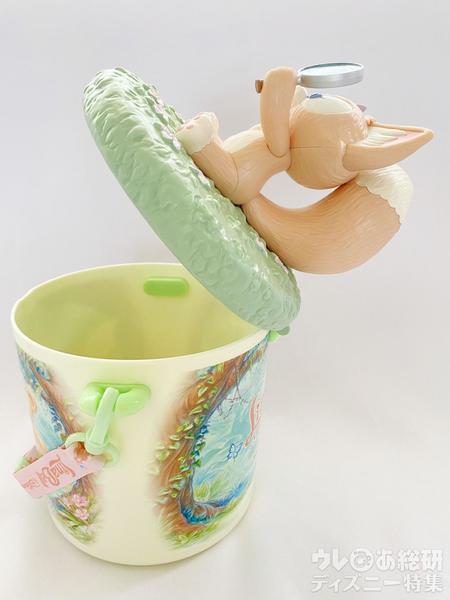 バケツ型の蓋の上に虫眼鏡を持ったリーナちゃん。