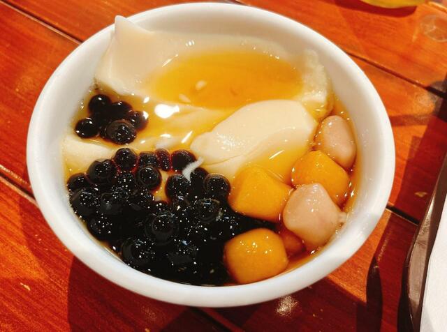 シロップの甘さは控えめなので、このボリューム感でも飽きずに最後まで食べられます。タピオカと芋園がトッピングされており、なめらかな豆花の食感と、モチモチしたタピオカ・豆花の食感を楽しめます。