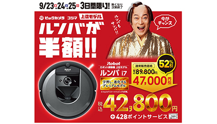 ビックカメラグループは9月23~25日の3日間限定で、大人気のロボット掃除機「ルンバ」の上位モデル「ルンバ i7」が約半額になる「メガセール」を開催する。ビックカメラ・コジマの各店やビックカメラグループのインターネット通販サイトなどで販売。今回限りの購入特典も用意している(予定台数に達した段階で販売を終了)。