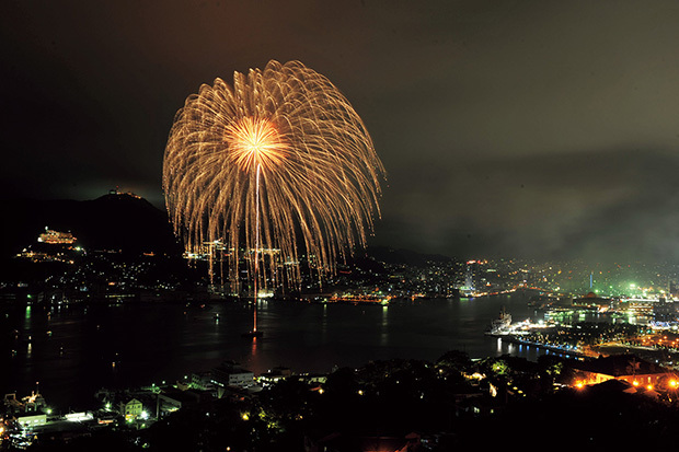 港湾都市長崎の海の魅力を伝えるイベントのフィナーレに花火を打ち上げ。稲佐山、風頭公園などから見える「世界新三大夜景」認定のシティビューと花火をダブルで観賞するのがおすすめ。