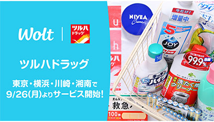 デリバリーサービス「Wolt(ウォルト)」を展開するWolt Japanは、ツルハホールディングスが展開する「ツルハドラッグ」の関東エリアにおけるデリバリーを開始し、9月26日よりサービスをスタートする。