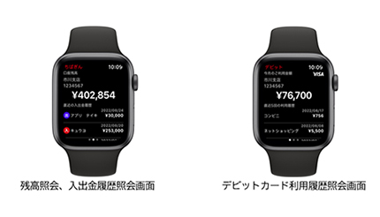 Apple Watch向け「ちばぎんアプリ」では、「残高照会、入出金履歴照会機能」と「デビットカード利用履歴照会機能」を提供する。「残高照会、入出金履歴照会機能」では、現在の口座残高、前月から当月の直近10件の入出金履歴を表示する。また、ちばぎんIDに利用口座を登録すれば、複数口座の切り替えが可能。給与の入金や家賃の引き落としにともなう出金などを簡単に確認できる。