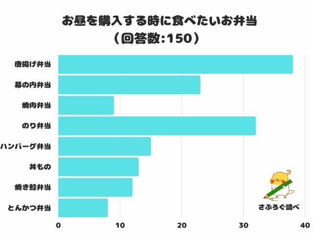 150人にアンケートを行ったところ、「唐揚げ弁当」と回答したのは全体の25.3%でした。また回答した理由として、唐揚げが好きという意見や、好きだけど自分で作るのは大変だからといった意見が数多く見受けられました。