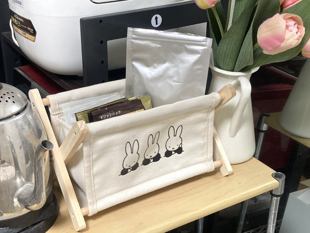 キッチンのポットの横に置いて、インスタントコーヒーや紅茶、お茶のパックなどを入れてみました。