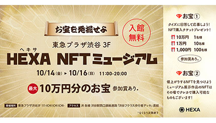 メディアエクイティの運営するNFTマーケット「HEXA(ヘキサ)」は10月14日~16日の期間、NFTの展示会「HEXA NFTミュージアム」を、東急プラザ渋谷(東京都渋谷区)3階の「111-ICHI ICHI ICHI-」にて開催する。