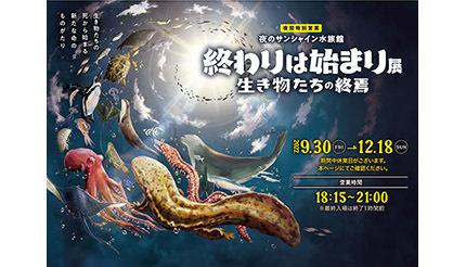 サンシャインシティは9月30日~12月18日の期間、同社の運営する「サンシャイン水族館」(東京都豊島区)において、夜間特別営業「終わりは始まり展~生き物たちの終焉~」を開催する。料金は、大人(高校生以上)が2400円、こども(小・中学生)が1200円、幼児(4歳以上)が700円(金・土・日・祝日・祝前日は大人2600円)。