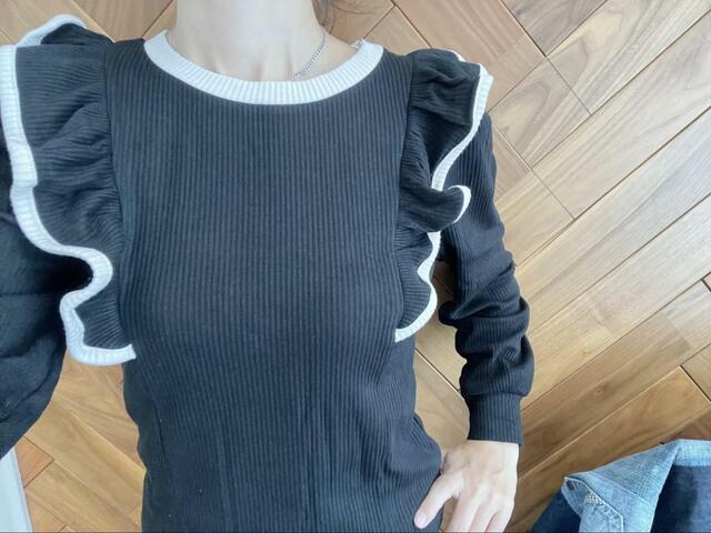 配色パイピングの効果によって、フリルが最大限に強調されたガーリーなトップスです。