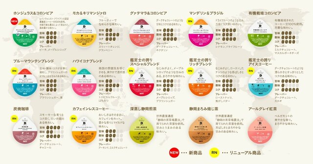 うちコーヒー8種類が、従来の苦味・酸味・コクといった味覚の特徴はそのままに、豆の産地の個性が際立つようなブレンドや焙煎になるよう、9月1日よりリニューアルされています。