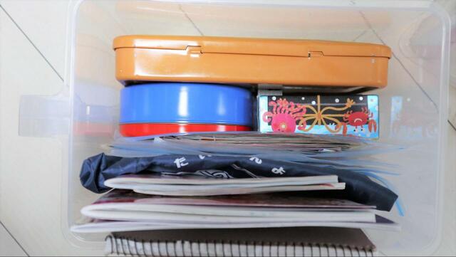 Sサイズには、ぬり絵用のマーカーやカルタ、折り紙など、「勝手に出されると片付けに困りがちな子どもの遊び道具」を入れました。