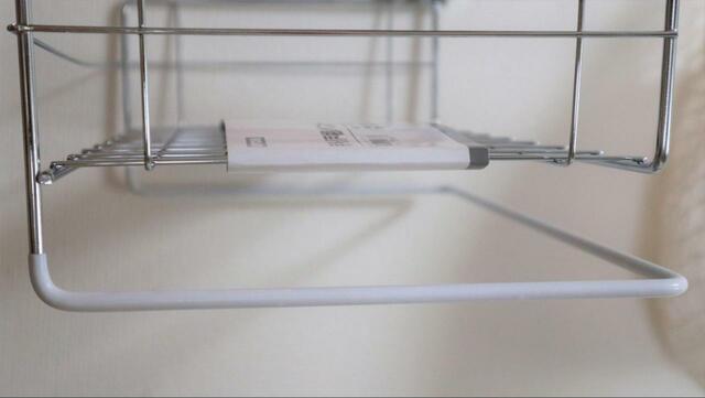 最後に、セリアの「キッチンワイヤーディッシュラック」を、棚板の端に差し込みます。