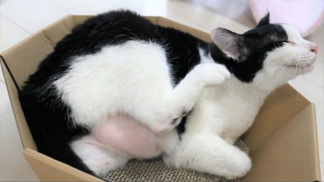 ハチワレは体型のせいもあり、この中ではいつもお腹を出してでろ~んと横になるリラックス体勢でくつろいでいます。