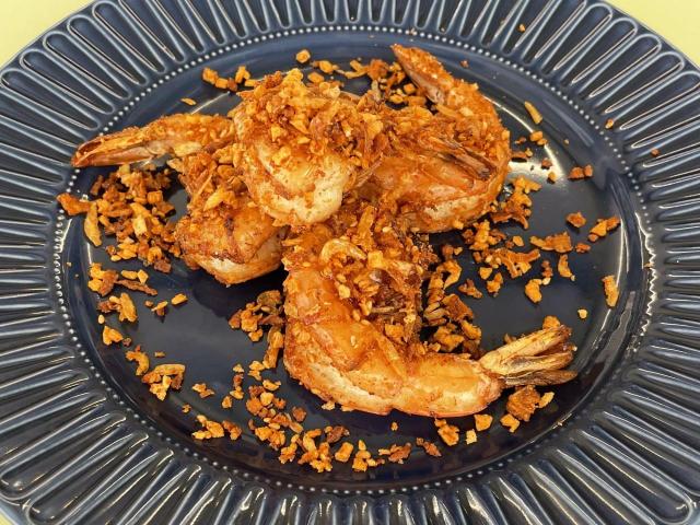 「海老の毛沢東(1280円)」は太い海老(タイショウエビ?)を殻付きのまま炒め、ニンニクや複数のスパイスやオキアミのような干し海老で味付けをした一品。