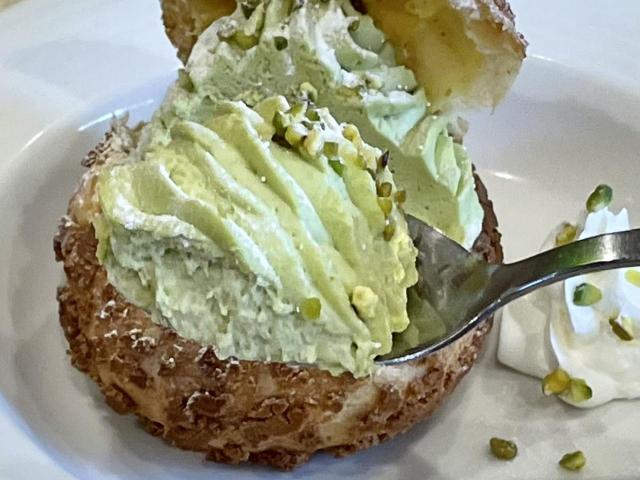 「シューの中にピスタチオのカスタードクリーム、ホイップクリーム、生クリームをつめてあ