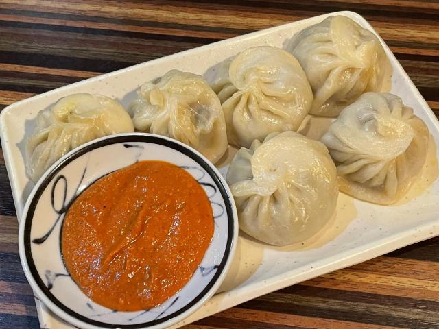 中国では小籠包をそのままか、生姜が入った酢醤油で食べるが、この店の「モモ」には赤いソースが付いてきた。