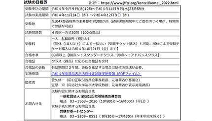 この検定試験の令和4年度(22年度)の日程等は図の通りであり、受験申込期間の締め切りは22年11月9日(水)23時59分となっている。ちなみに、令和3年度(21年度)の受験者数は1309人で合格者は199人、合格率は15.2%となっている。
