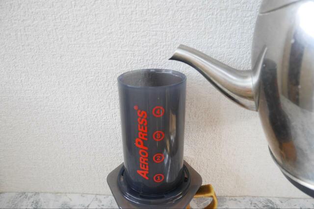 5.軽く振ってコーヒーの粉を均一にならし、①のところまで80℃のお湯を注ぎます。