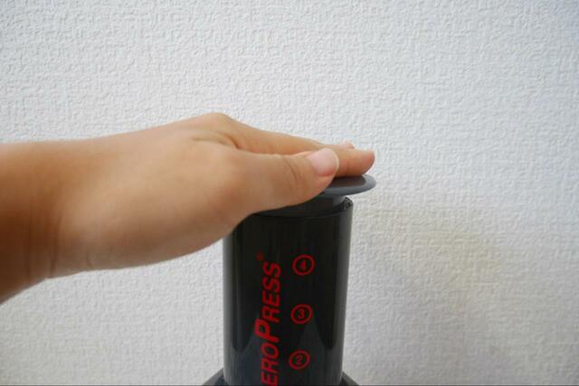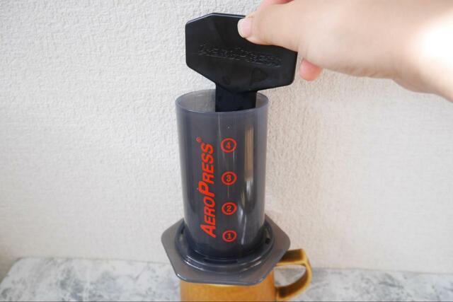 7.プランジャーを挿入してプレスします。このとき少し力が必要なので、分厚く安定したカップを使うのがおすすめです。