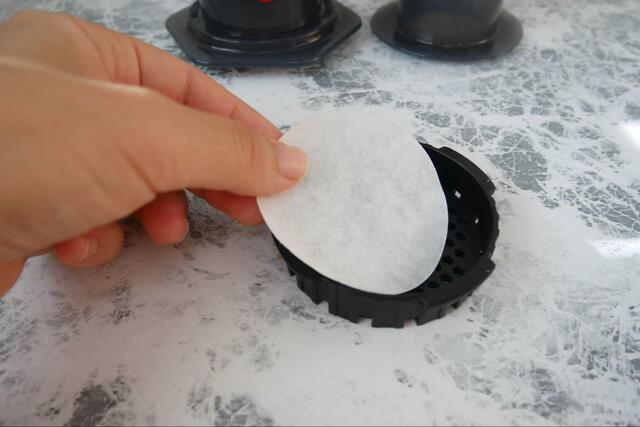 4.チャンバーをコーヒーカップの上にのせ、コーヒーの粉をスクープ1杯入れます。