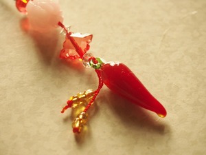 したがって、赤の唐辛子に、赤のストラップひも、さらに「実り」を意味するという、花のモチーフの組み合わせを選択してみた。