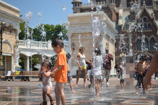 お目当てはウォーターフロントパーク。正面にタワーオブテラーが見える噴水広場です。どうせ着替えるんだから、心ゆくまでずぶ濡れになってしまいましょう。小さな子供が多いので、はしゃぎすぎには注意!