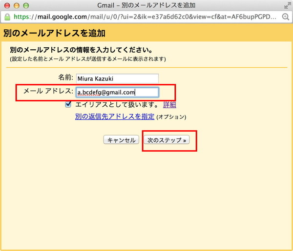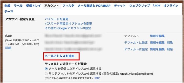 GmailをWebページから使用している場合は設定画面を開き、「アカウント」の「名前」にある「メールアドレスを追加」をクリック。そして「.」(ピリオド)を変更したメールアドレスを登録しましょう。その後確認メールを受け取って認証すればOK。