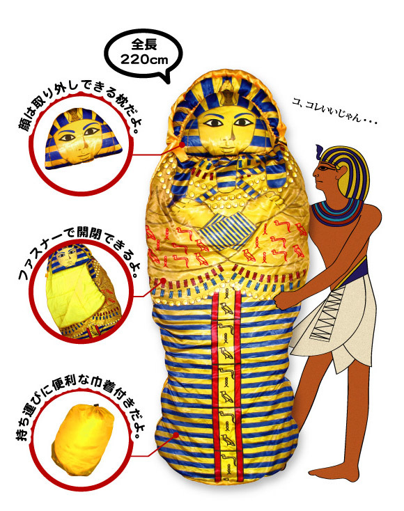 ツタンカーメンになったような気分になることができる寝袋。金ピカです!