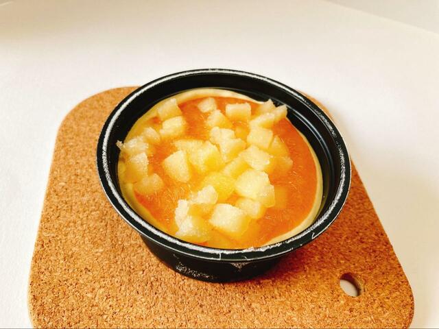 クッキークランチを土台にし、その上においもアイス。表面にはリンゴダイスとリンゴソースがトッピングされています。リンゴソースからはシナモンのいい香り!蓋を取った瞬間「アップルパイだ!」とはっきりわかります。