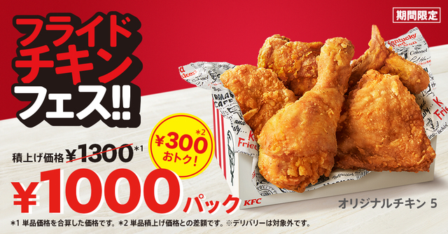 「1000円パック」…1,000円 (積上げ価格1,300円) 〔オリジナルチキン5ピース〕