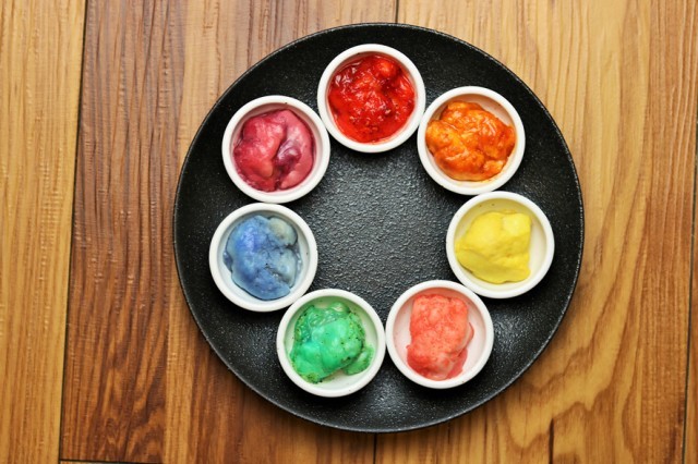 ピンク・黄・緑・オレンジ・青・紫・赤の「レインボーホルモン」は、ピンク=明太子、黄=レモン、緑=バジル、オレンジ=カレー、青=ミント、紫=赤ワイン、赤=ピリ辛唐辛子を使って色付けされています。色だけでなく、7つの味も楽しむことができるのです!