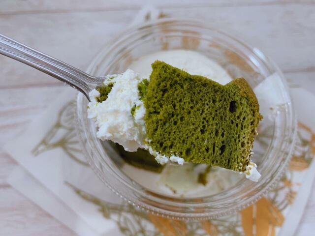 大きめのカップにぎっしり入った抹茶シフォンと、たっぷりのクリームが目を引きます。