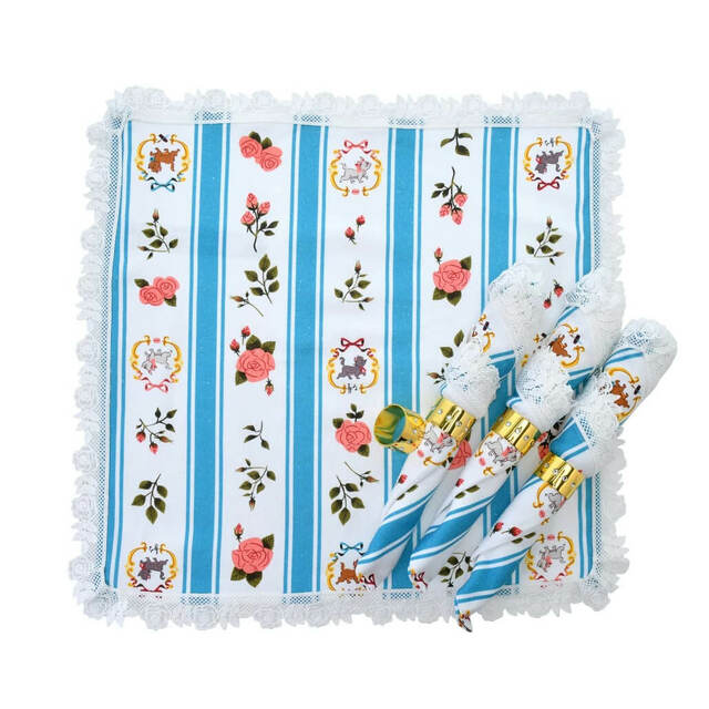 テーブルナプキンは、白と水色のストライプカラーに、マリーたちやバラをデザイン。