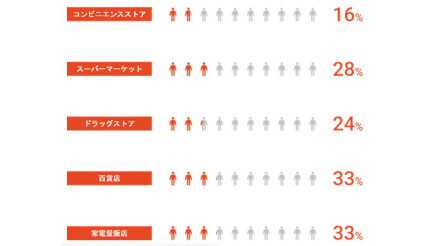 調査対象者に、店舗に行くと“ワクワクする”と感じるものをすべて選んでもらったところ(複数回答)、「百貨店」と「家電量販店」(どちらも33%)がもっとも多く、「コンビニエンスストア」(16%)は最下位となった。