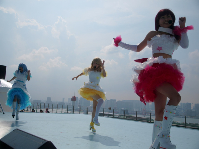 そこにいたのは、おおー髪がすごい色になってます!超アニメ系微少女ユニット【KiraLyraHeart】で、こちら初見グループだったんですが、髪の毛の色がインパクト強くて目立たないかもですが相当みなさん美少女揃いじゃないですか。雲と青空をバックに見るアニメチック美少女は、本当に二次元満載だったなぁ。