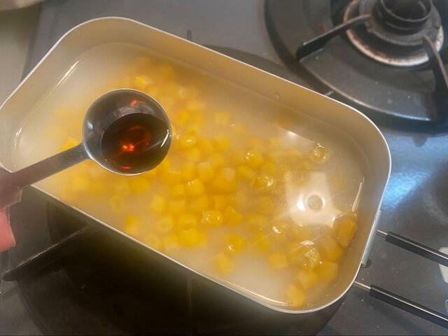 2:30分浸水させたお米にコーン、醤油を入れて軽く混ぜます。