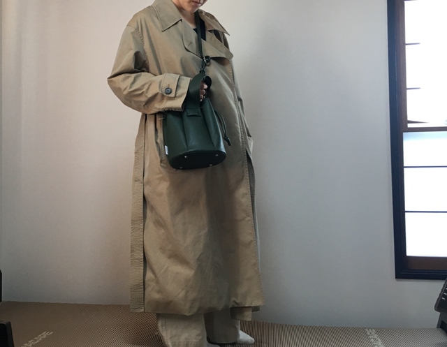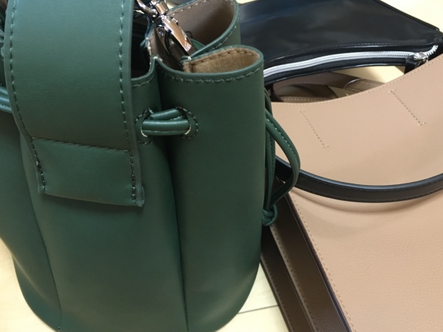 ハイブランドのような高級感のグリーンの巾着バッグ。筆者はこの形のバッグを持っていなかったのですが、とてもかわいいです。