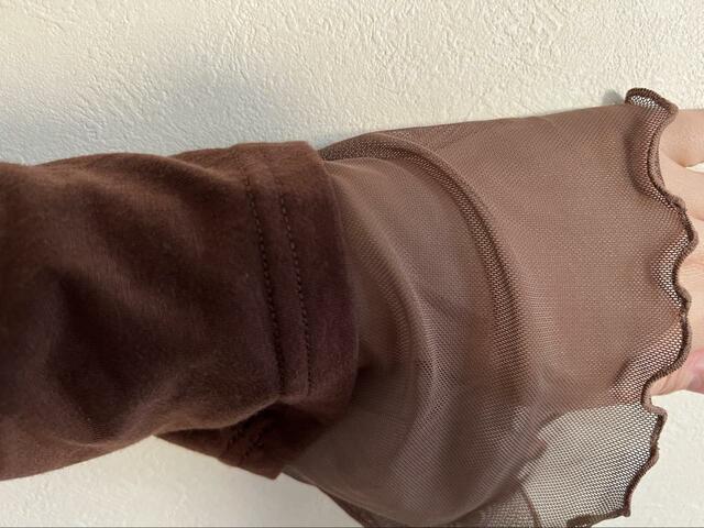 シアー素材をおもてにして着るのも非常にかわいいですが、おすすめはシアー素材を裏面にした着方です。シアー素材を裏面にした場合、袖からシアー素材がチラ見えします。