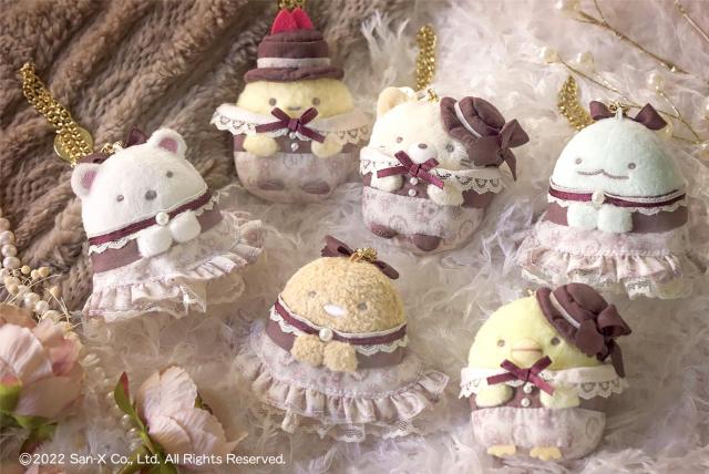 オリジナルの花柄のドレスやリボンでおめかししているすみっコたちのバッグチャーム。