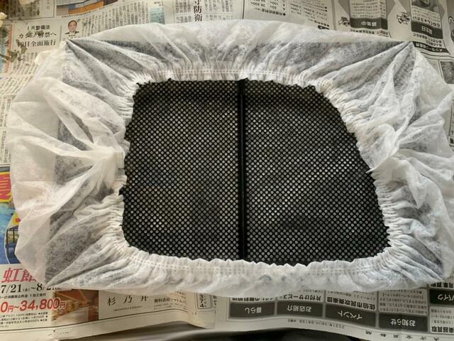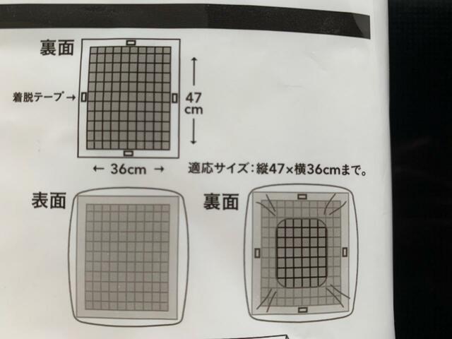 適応サイズは縦47cm×横36cm以内で、我が家の換気扇フィルターは2枚合わせたサイズが27cm×40cmだったので、2枚まとめてかぶせることに。