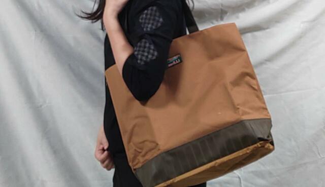 バッグは、口の部分の巾着を締めて持ってみると、また一味違った雰囲気になります。