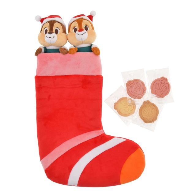 サンタがプレゼントを入れてくれる大きな靴下から、ちょこんと顔を出すチップ&デールが可愛いぬいぐるみ。