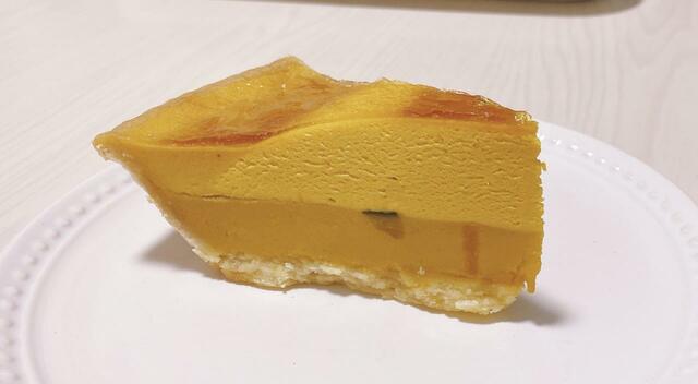 かぼちゃのムースとかぼちゃのプリンが2層になった「かぼちゃのタルト」。外側のタルト生地はサクサクとした食感。ムースをやさしいくちどけ、そしてすこし硬めのプリンにタルトのサクサク感。さまざまな食感を味わえます!